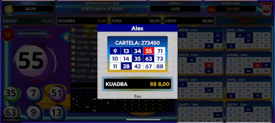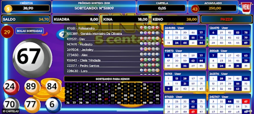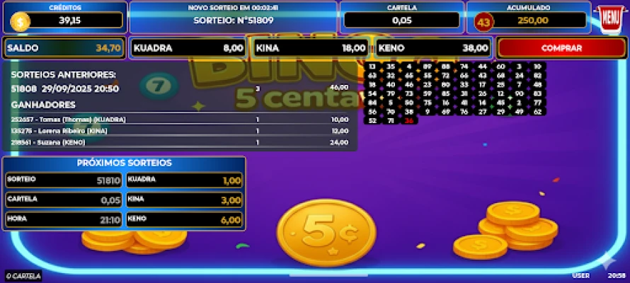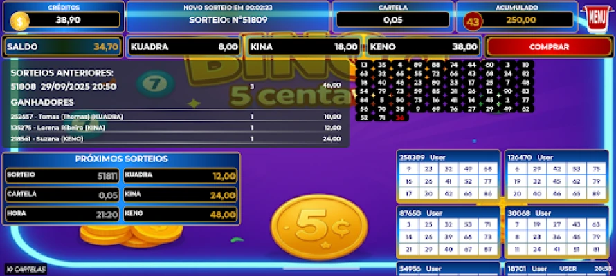 Experimente a emoção do Bingo 5 Centavos! Participe de partidas em tempo real e conecte-se com outros jogadores online. Desfrute de um ambiente leve, interativo e cheio de surpresas. É pura diversão para adultos que apreciam o bingo social, sem apostas ou prêmios em dinheiro real.