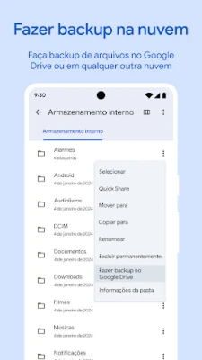 Vá além da gestão básica com funcionalidades robustas. Reproduza suas mídias offline diretamente no Files do Google, com controles avançados de reprodução que incluem velocidade e ordem aleatória. Mantenha seus dados seguros e libere ainda mais espaço realizando backups facilitados para o Google Drive, cartão SD ou outros serviços de nuvem instalados. Com o tempo, o Files do Google aprende com seu uso e oferece recomendações inteligentes e personalizadas para otimizar ainda mais o armazenamento e proteger seu dispositivo, tudo isso em um aplicativo leve, com menos de 20 MB de uso de espaço, e totalmente livre de anúncios, desenvolvido com a confiabilidade do Google.