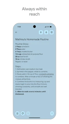 Para além de ser o seu bloco de notas pessoal, o Google Keep eleva as suas ideias a um novo patamar de colaboração. Partilhe as suas anotações sem esforço com amigos e familiares, e trabalhem em conjunto em tempo real, seja para organizar um evento surpresa ou gerir tarefas partilhadas. Encontrar o que precisa é incrivelmente simples. Organize as suas entradas com cores vibrantes e etiquetas intuitivas, transformando o caos em clareza. Uma pesquisa rápida revela exatamente o que procura, eliminando a perda de tempo. Fixe as notas essenciais diretamente no ecrã principal do seu telemóvel ou tablet, ou utilize os mosaicos do Wear OS para um atalho visual e imediato.