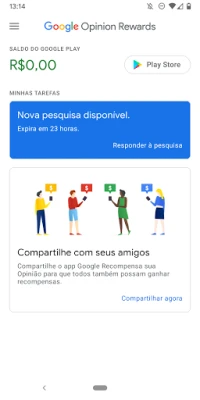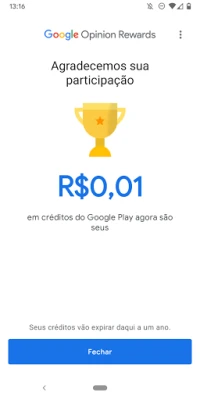 Google Recompensa sua Opinião, da equipe Google Surveys, transforma sua voz em recompensas. Participe de pesquisas breves e receba crédito do Google Play, uma maneira fácil de aproveitar o conteúdo da loja. Expresse sua opinião e seja valorizado.